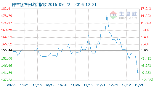 12月21日鋅與鍍鋅板商品比價指數為142.97,較昨日上升了1.89點,較周期內更高點179.56點(2016-11-28)下降了20.38%,較2012年06月28日更低點96.53點上漲了48.11%。(注:周期指2012-01-01至今)